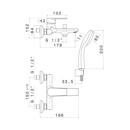 - Baterie lavoar fără ventil, baterie cadă cu pară duș de mână și furtun flexibil 15 cm