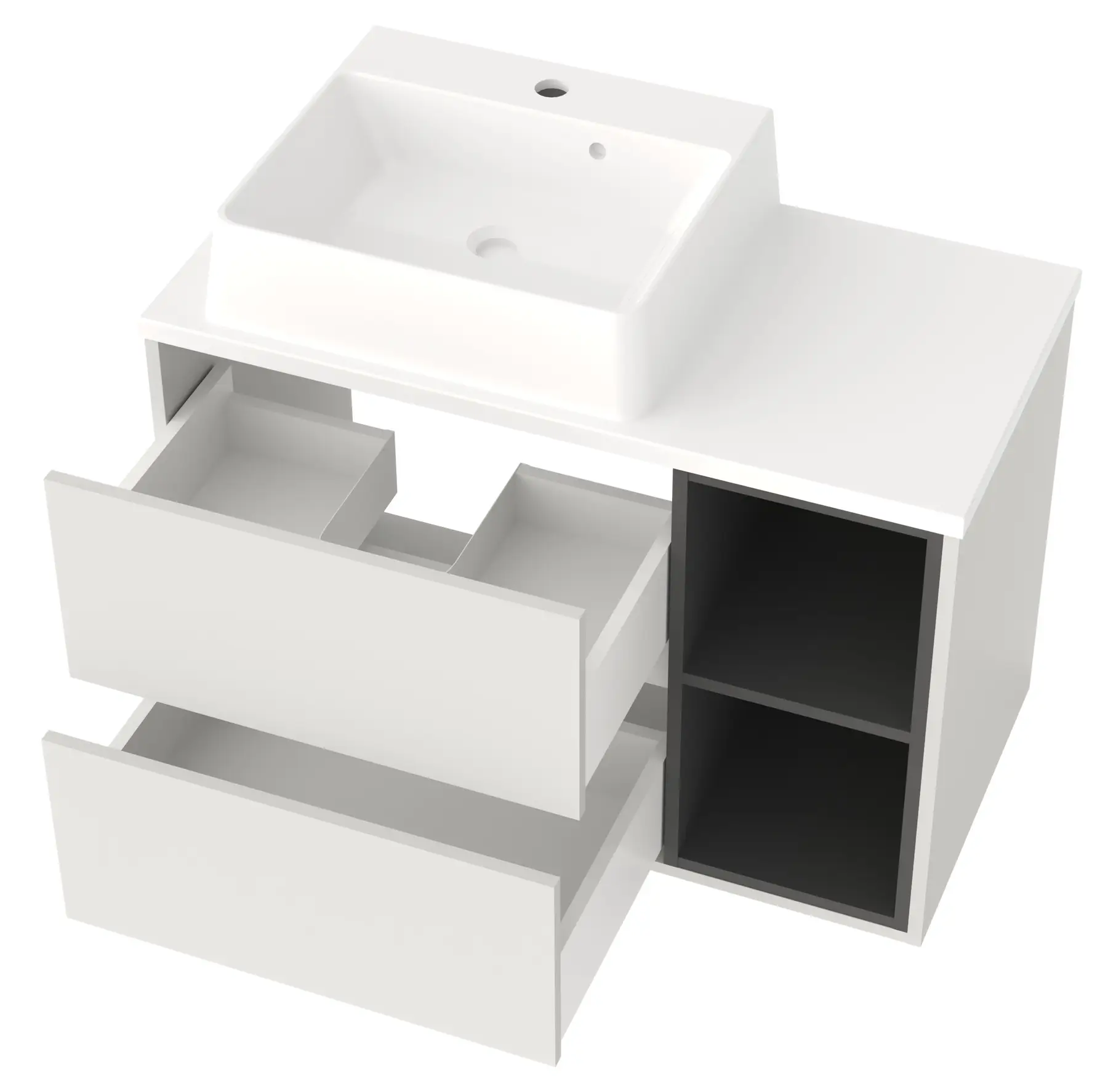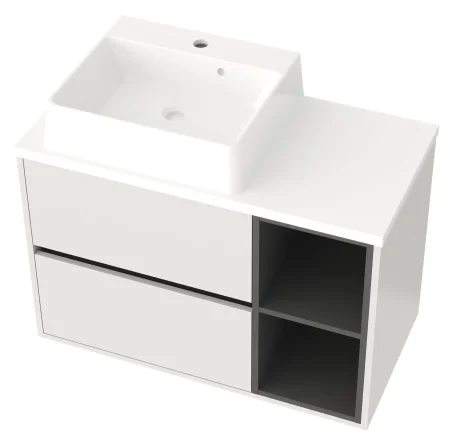 - Blat din mdf vopsit alb mat, lavoar din compozit, orificiu baterie, preaplin