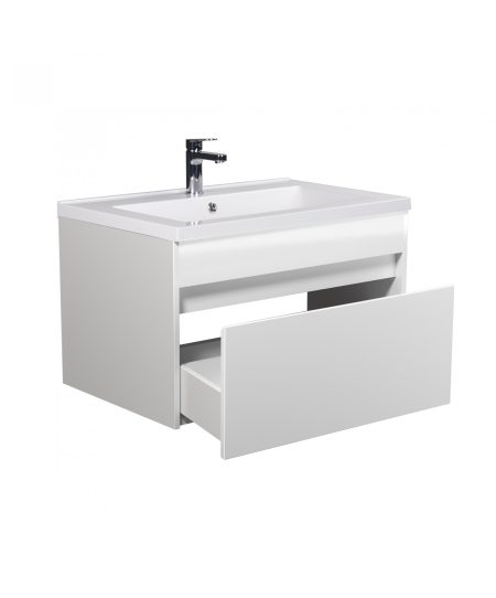 • Material: fețele sertarelor din mdf vopsit alb lucios, carcasa mobilierului din pal laminat
