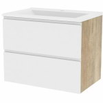 - Material: fețele mobilierului din mdf vopsit alb mat, carcasa mobilierului din pal laminat cu laterale aspect de lemn – stejar înfoliat